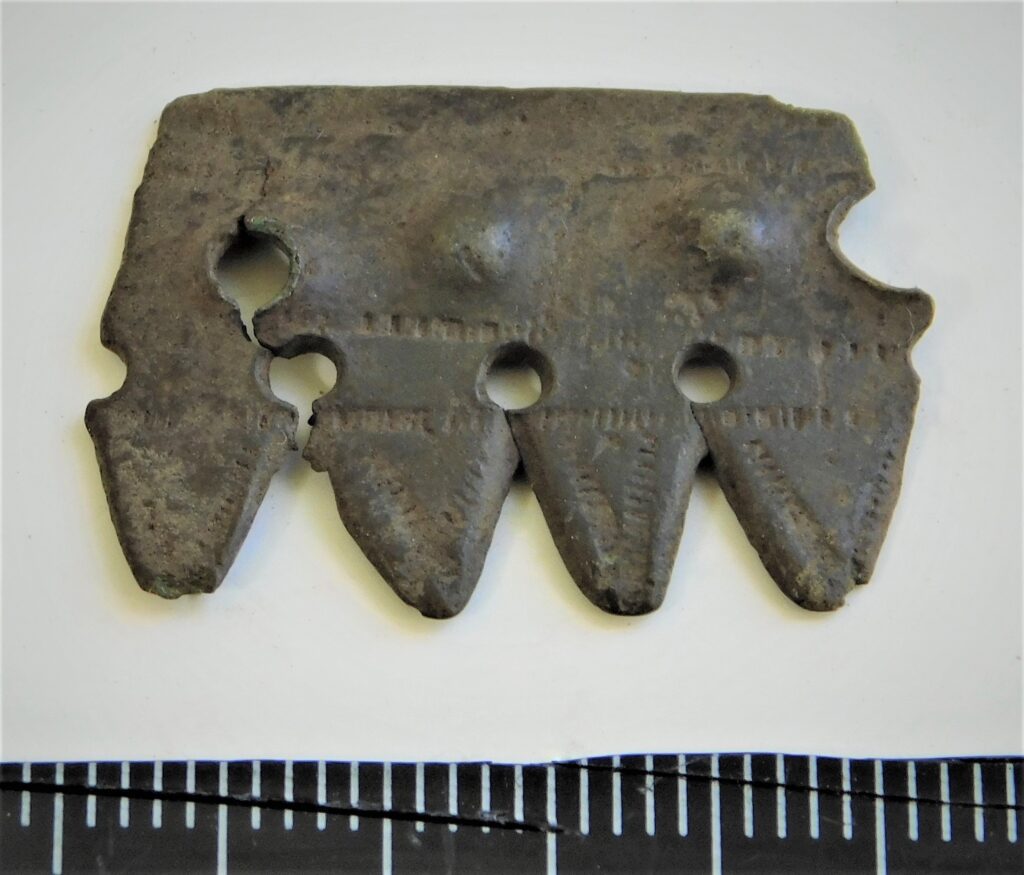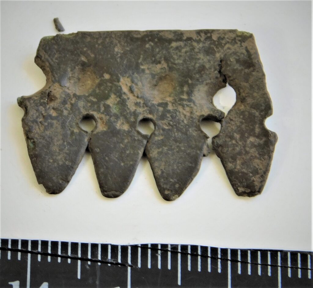 Keekandja tükk, pronks, tinutatud, tüüpilise kontsentrilistest ringidest ornamendiga. Sellised keekandjad olid Kuramaal ja semgallias levinud koos peamiselt 7.-10. sajandini dateeritavate nõeltega, kuid Rahu kalmes Saaremaal on üks selline ka koos 10. sajandi lehtornamendiga kolmnurkpeanõeltega.