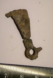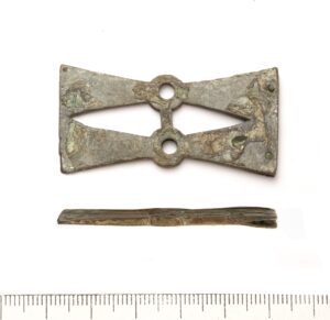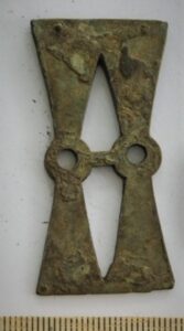 Esemekatke, pronks. Mõõgavöö või -tupe peal olnud rihmaaas. Pikem osa on üleni kaunistatud pikijoontega. Ots pöördub täisnurga all allapoole ning lõpeb ülejäänud osa suhtes ristipidi paikneva ovaalse plaadikesega, mille kummaski osas on olnud väike pronksneet, neist üks murdunud. Olnud mingi puust või nahast eseme peal. Võimalik, et pärit samast vööst või ühest vöödest, kust ka Ure propellerikujulised naastud (Jørgensen & Petersen 2003, 267).