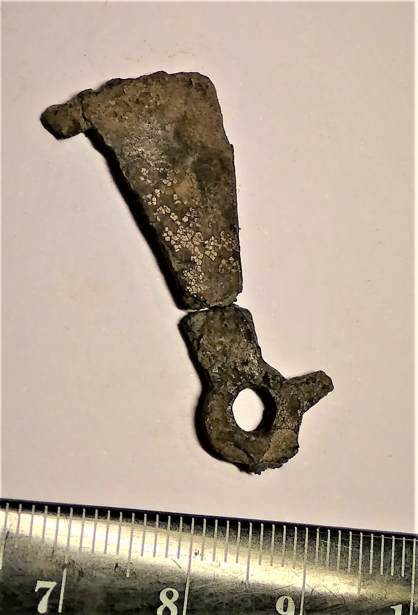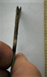 Esemekatke, pronks. Pikem osa on üleni kaunistatud pikijoontega. Ots pöördub täisnurga all allapoole ning lõpeb ülejäänud osa suhtes ristipidi paikneva ovaalse plaadikesega, mille kummaski osas on olnud väike pronksneet, neist üks murdunud. Olnud kõrgem aas mingi nt puust või nahast eseme peal. Lähtudes analoogidest (vt leid nr 10862:1) võib olla kas vöönaast või mõõgatupe peal olnud naast, kust mõõgavöö läbi käib.