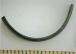 Kaelavõru katke, pronks. Ümmarguse ristlõikega. Ühel küljel olnud kaetud diagonaalse viirutusega.