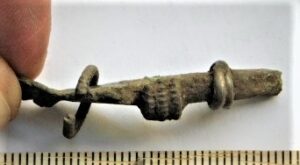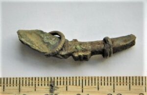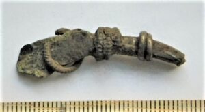 Ambsõle katke, hõbe ja pronks. Sõle kaare ülemine osa. Kaela peal on olnud hõbedast rõngaskaunistus. Ilmselt on olnud kaks hõbedast rõngasgarnituuri, mille vahel on kolmekordne pronks(?)garnituur, eelmisest madalam. Kaela murdunud ristlõige ruudukujuline, peaosa lame.