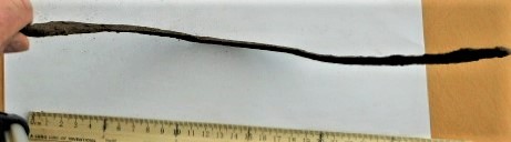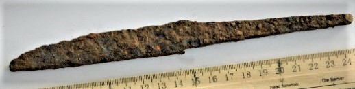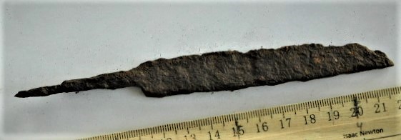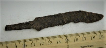 Jalus, raud+hõbe. Sarnaseid on leitud nt Birkast (Arbman 1940, eriti Taf. 35: 1-2) ja Hedebyst (Schiezel 2014, 582). Üks on varem teada ka Saaremaalt (AI K 89: 28).
