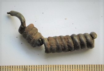Ambsõle katke, pronks või hõbe. Sõle kaare spiraalteljest. Sees on säilinud raudpulka.