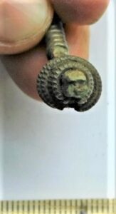 Ambsõle katke, hõbe+pronks+raud. Ülemine osa kaarest, mida on läbinud spiraaltelg; veidi on augus säilinud ka rauda. Peanupp mässitud hõbetraadiga. Kaela peal kolm hõbetraadist rõngasgarnituuri ning nende vahel üks reljeefne vöönd, mis jäljendab eelnevaid. Kaela ristlõige ruudukujuline. Tõenäoliselt kohalik toode, 3. sajandi lõpp-4. sajandi algus.