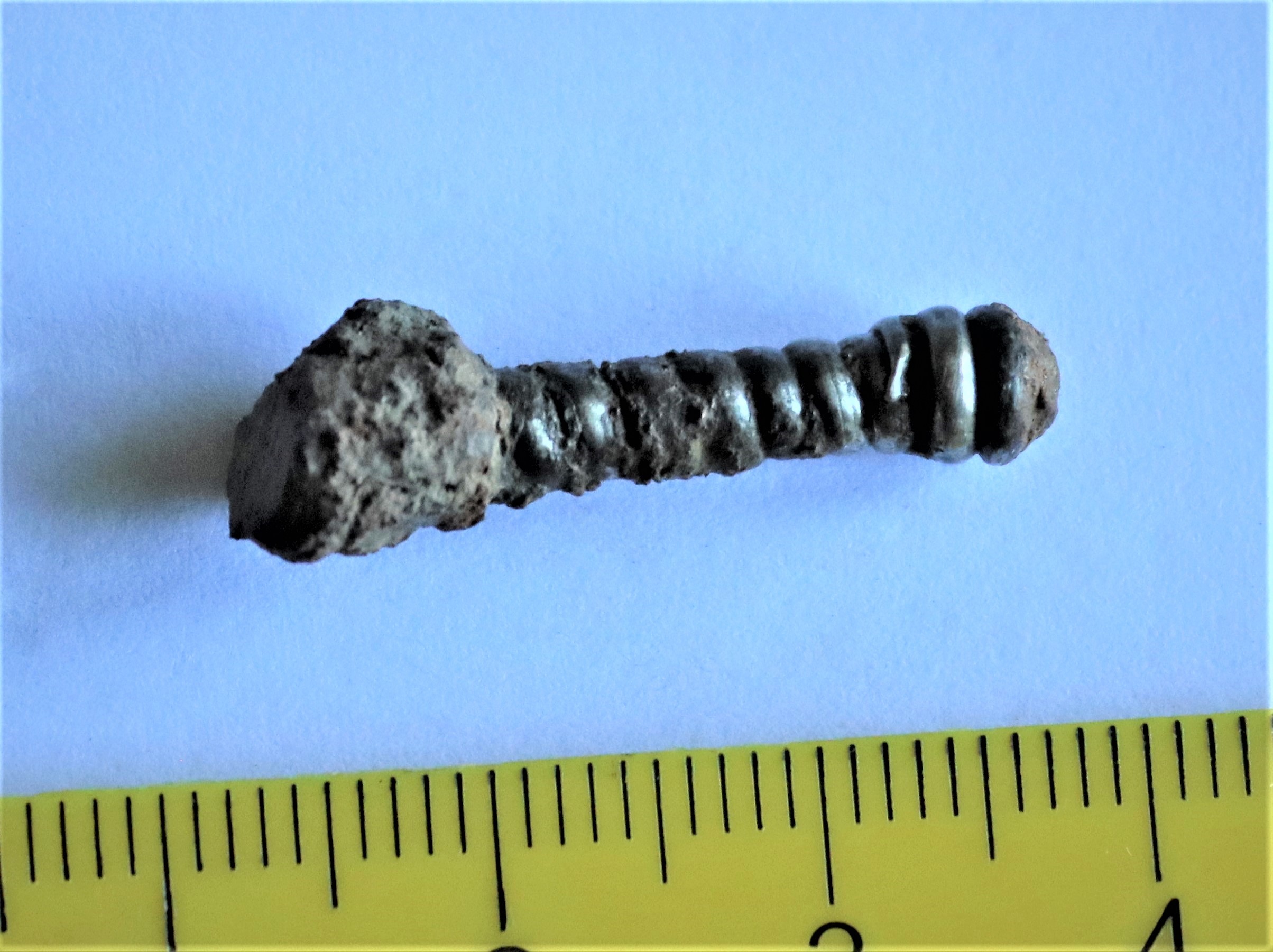 Ambsõle katke, pronks + raud + hõbe. Tükk hõbetraadiga mässitud pead ja kaare detail.