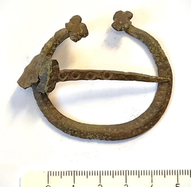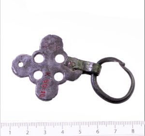 Ristripatsiks tehtud ristpeaga nõel, pronks. Risti neli ümmargust haru on ühendatud kumerate kaartega. Selliseid ehtenõelu leidub 13. sajandi laibamatustes, kivikalmetes on nad harvad. Ripatsiks tehtud ese kuulub 13.-14. sajandisse.