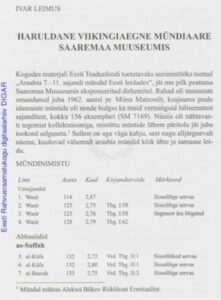 Soorsk, M. (2005). About the formation of the collection of objects of Saaremaa Museum. (EST: Saaremaa Muuseumi esemekogu kujunemisest). Saaremaa Muuseum, kaheaastaraamat 2003–2004 (271−304). Kuressaare: Saaremaa Muuseum.