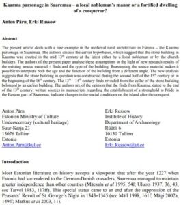 Pärn, A., Russow, E. (2005). Kaarma parsonage in Saaremaa – a local nobleman’s manor or a fortified dwelling of a conqueror? In: Praeities puslapiai: archeologija, kultūra, visuomenė. (49−70). Klaipėda: Klaipedos universiteto Baltijos regiono istorijos ir archeologijos institutas: Klaipedos universit.