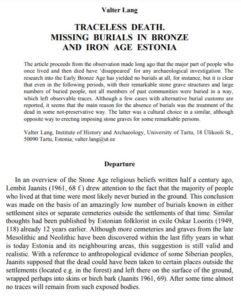 Lang, Valter (2011). Traceless death. Missing burials in Bronze and Iron Age Estonia. Estonian Journal of Archaeology, 15, 2, 109−129.