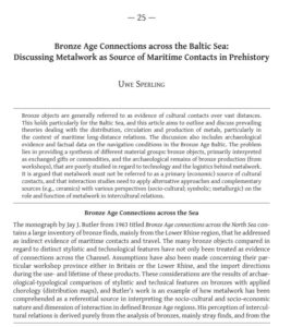 Sperling, U. (2016). Bronze Age Connections across the Baltic Sea: Discussing Metalwork as Source of Maritime Contacts in Prehistory. In: Hein Bjartmann Bjerck (Ed.). Marine Ventures – Archaeological Perspectives on Human-Sea Relations (399−416). Sheffield: Equinox Publishing. DOI: 10.1558/equinox.24570.