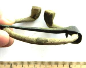 Penannular brooch with widening knob-shaped terminals, copper alloy. Similar ones have been found e g at Pöide and Valjala hill-forts, Karja and Valjala early Christian graveyards, and in the earliest layers of medieval Tallinn. Similar brooches are often found in 13th-14th-century inhumation graves and only seldom in stone graves with cremations. In Karja, such brooch was registered in an inhumation dated to the second half of the 13th century (Mägi 2002, Pl. 125: 1–2), but in Siksälä, South-East Estonia, they also occur in 14th-century graves (Valk et al 2014).