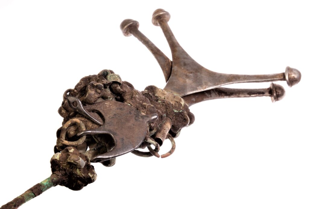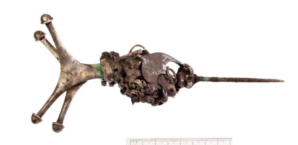 Triangel-headed dress pins, 2, with two semi-oval chain holders and chain arrangement wrapped around the pins. The heads of the pins are made of silver and decorated with Animal-style ornament. mushroom-shaped knobs. Other parts of bronze.
