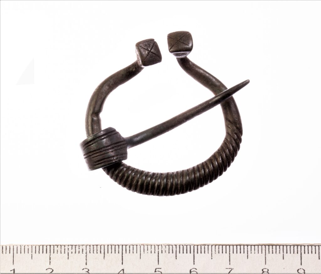 Penannular brooch with widening knob-shaped terminals, copper alloy.Similar ones have been found e g at Pöide and Valjala hill-forts, Karja and Valjala early Christian graveyards, and in the earliest layers of medieval Tallinn.