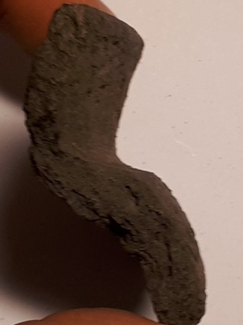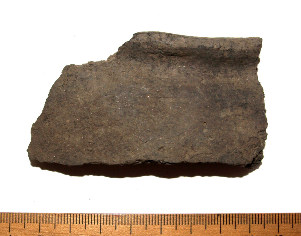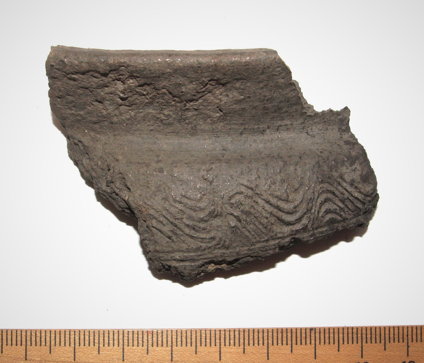 Potsherd, wheel-thrown ceramic, rim and profiled wall, decorated with wavy line.