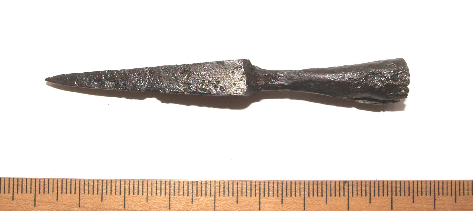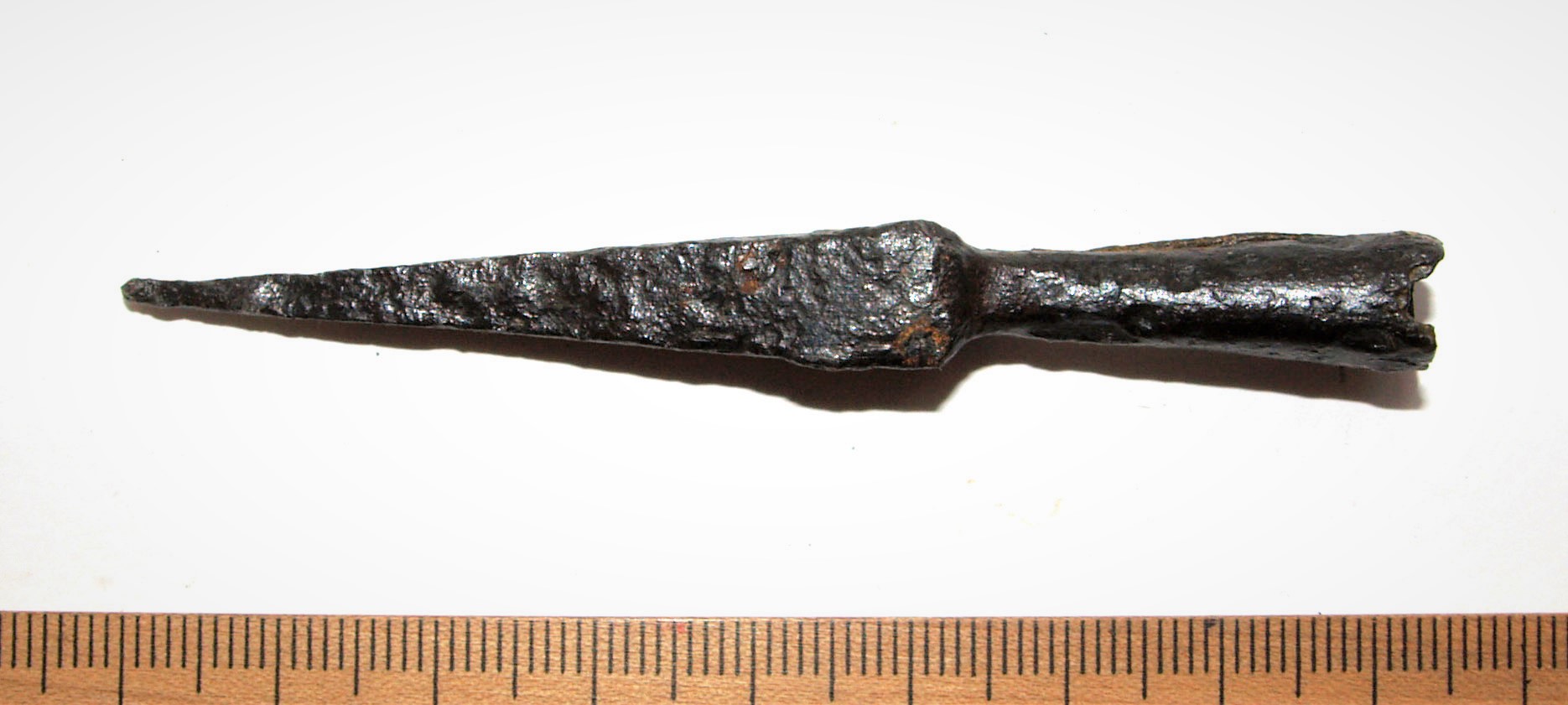 Crossbow bolt, iron. Crossbow bolt with a pyramid-shaped tip. The bolt has a wider part at the base, just before the socket. Mäesalu´s type A I. Compare with similar ones e g at Varbola hillfort (e g AI 3864: 1, 5299: 23, 305). Crossbow were taken into use in the Eastern Baltic as early as in the end of the 12th century, but heads of such type are in Estonia dated mainly to the first half of the 13th century (Mäesalu 1991). In Latvia they are dated from the end of the 12th century to the early 14th century (Mugurēvičs 2008, 202).