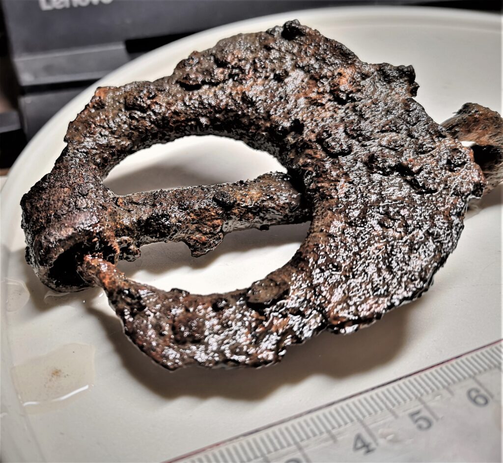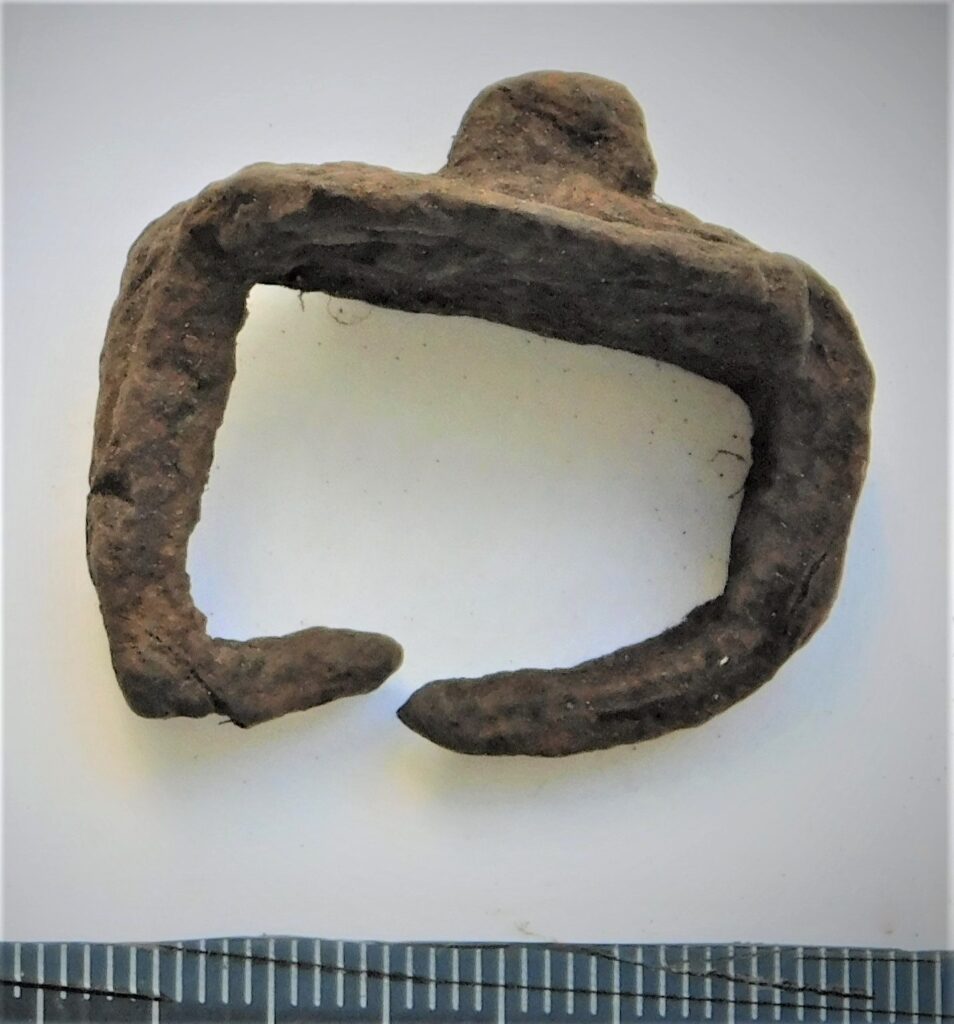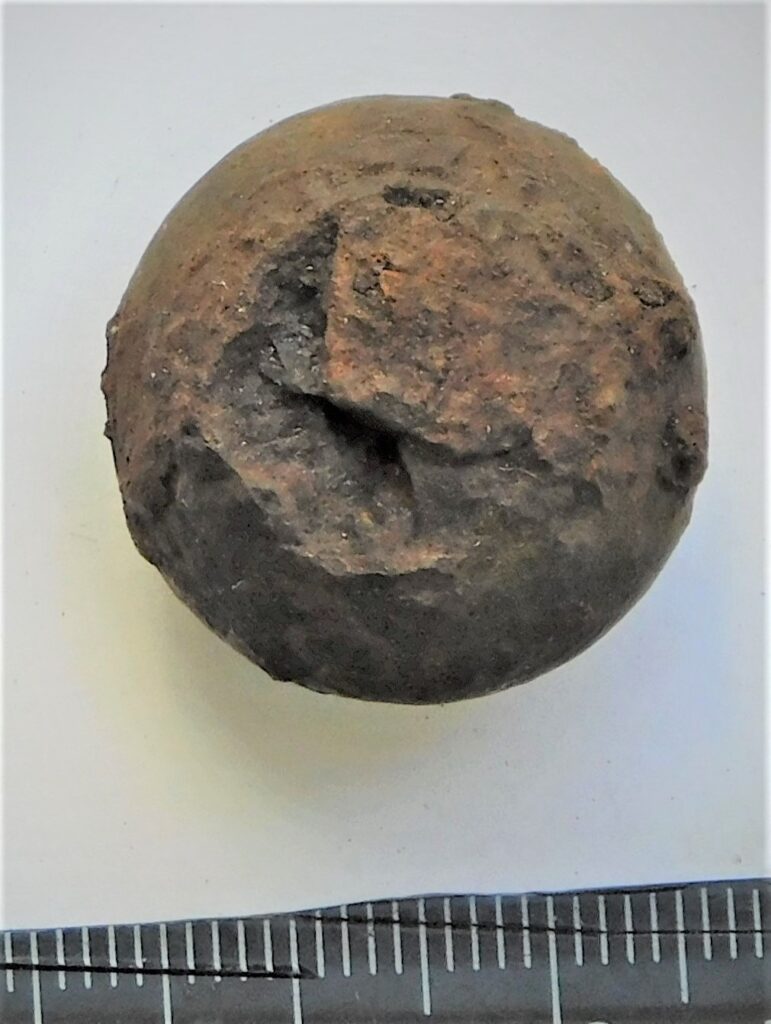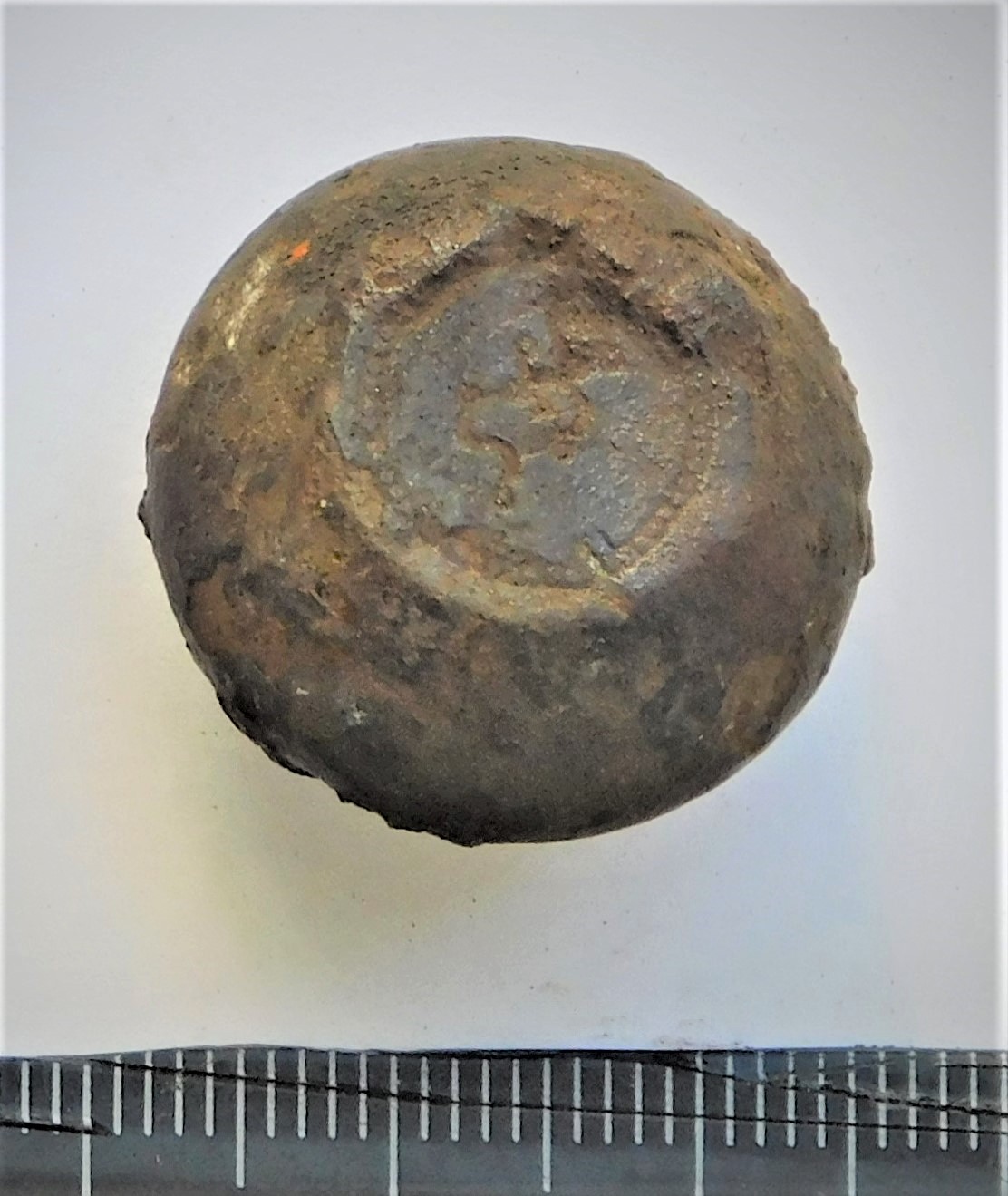 Spheric weight, faces marked with line formed of small rings, iron + bronze . Probably from the end of the 10th or from the 11th. century (Berga 2017).