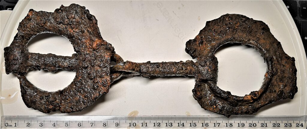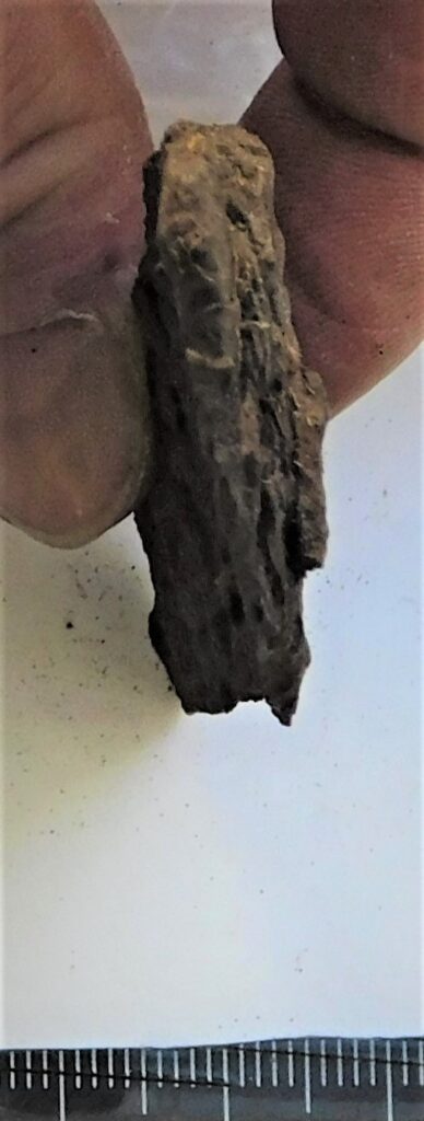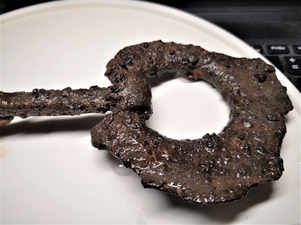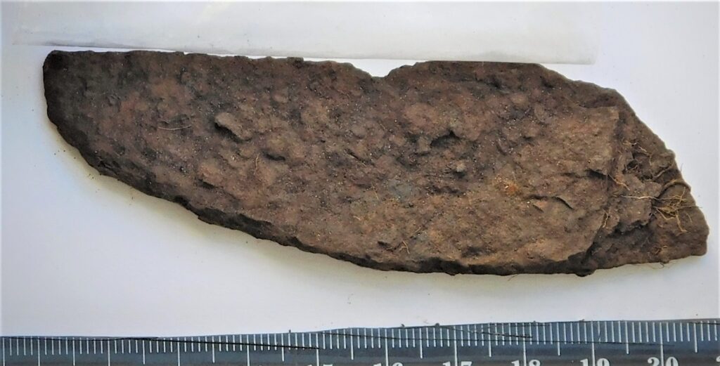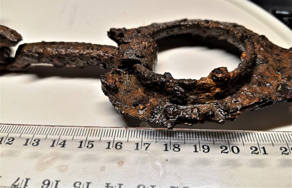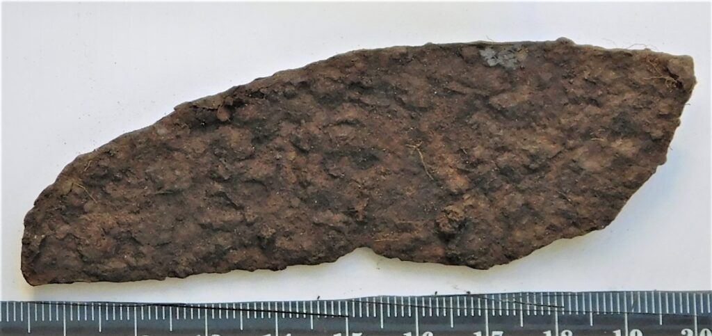 Spheric weight, faces marked with line formed of small rings, iron + bronze . Probably from the end of the 10th or from the 11th. century (Berga 2017).