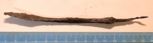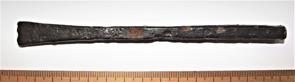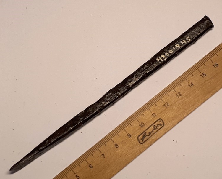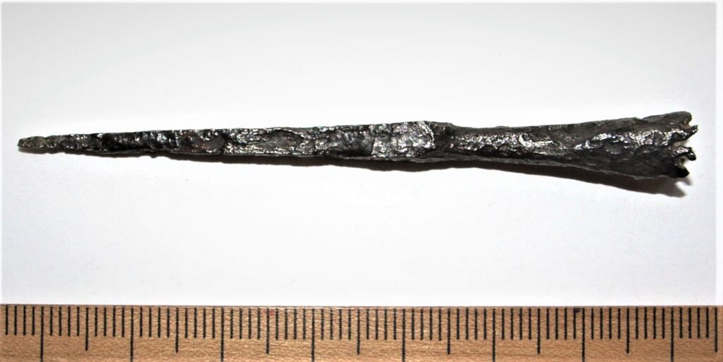 Crossbow bolt, iron. Crossbow bolt with a pyramid-shaped tip. The bolt has a wider part at the base, just before the socket. Mäesalu´s type A I Crossbow were taken into use in the Eastern Baltic as early as in the end of the 12th century, but heads of such type are in Estonia dated mainly to the first half of the 13th century (Mäesalu 1991). In Latvia they are datef from the end of the 12th century to the early 14th century (Mugurēvičs 2008, 202).
