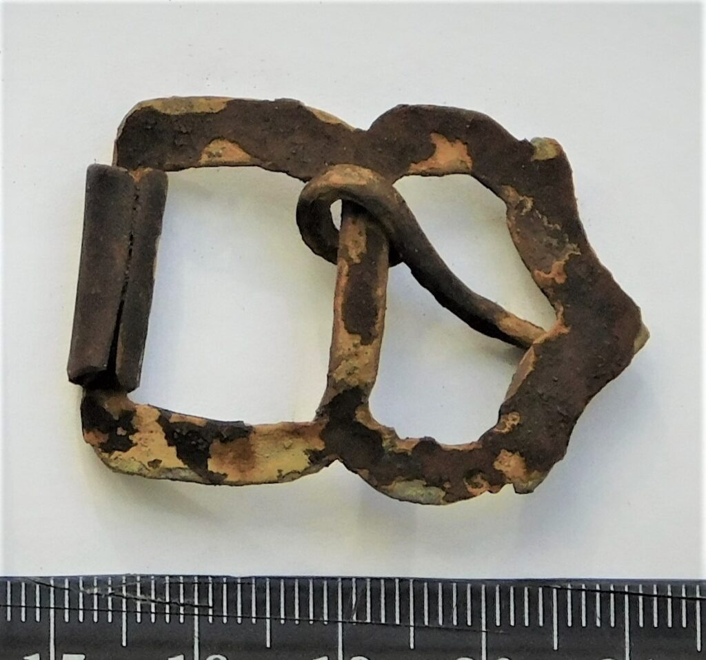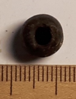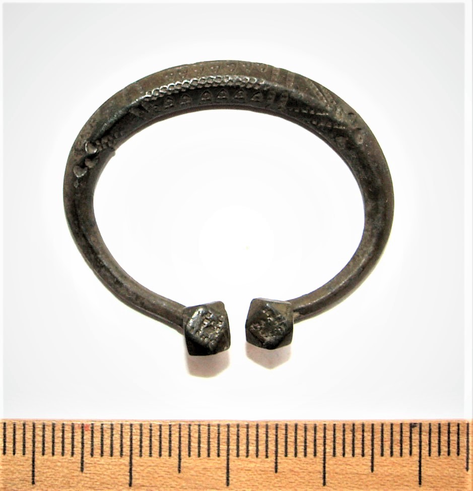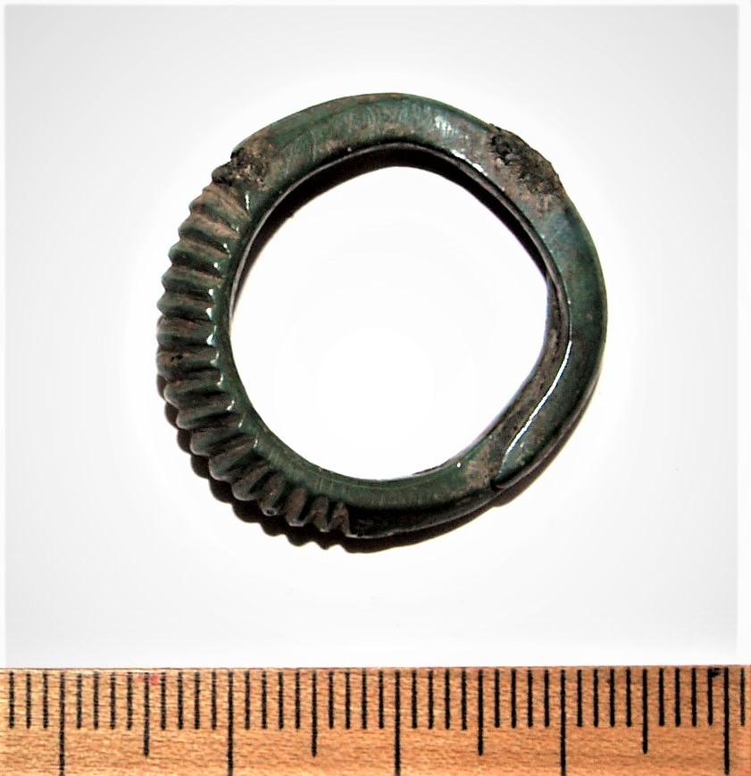 Finger-ring, bronze. This type of finger-ring has a thickened middle section with engraved diagonal grooves. A well-known type of ring in the archaeological material of the Estonian islands often found in both stone graves with cremations as well as inhumation burials. Could have come into use already during the 12th century AD (Mägi 2002, 109).