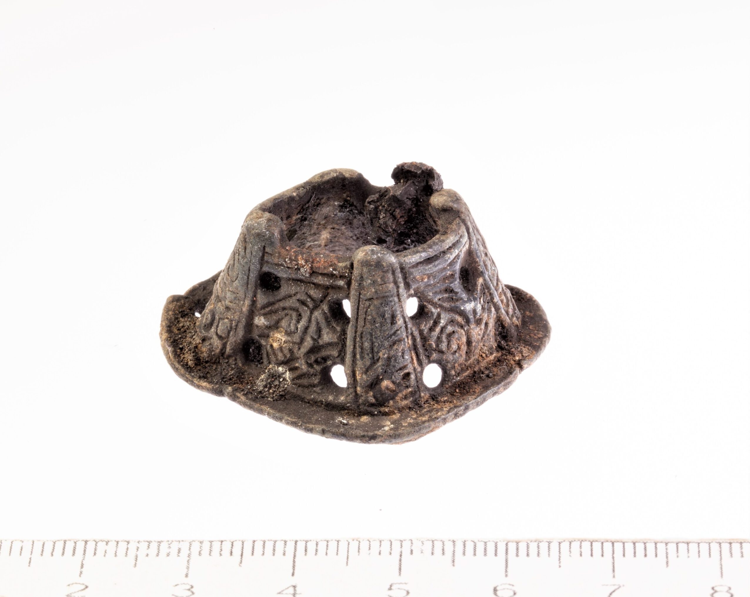 Box-shaped brooch with openwork ornament in Nordic Animal style, copper alloy. Two similar brooches have been found in Birka graves in Sweden (Arbman 1940, Taf 85: 6, 7; 1943, 117-118, 467-468). The second half of the 9th or the first half of the 10th century (Gustin 2017, 224, with reference to Johan Callmer).