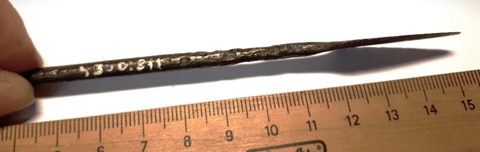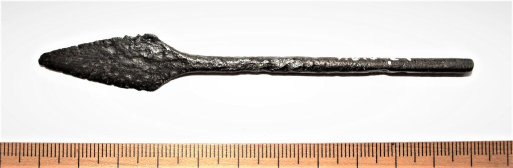 Tanged javelin head. Similar javelin head has been found, for instance, in grave No 5 at Dundaga Laukmuiźa, Couronia, which is dated to the second half of the 13th or the first half of the 14th century (Muižnieks & Žeiere 2021, Fig. 104).