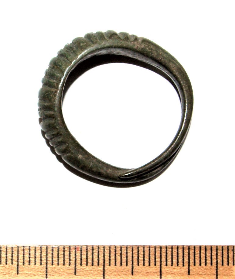 Finger-ring, bronze. This type of finger-ring has a thickened middle section with engraved diagonal grooves. A well-known type of ring in the archaeological material of the Estonian islands often found in both stone graves with cremations as well as inhumation burials. Could have come into use already during the 12th century AD (Mägi 2002, 109).