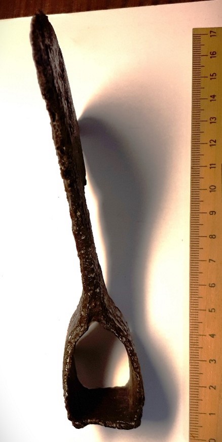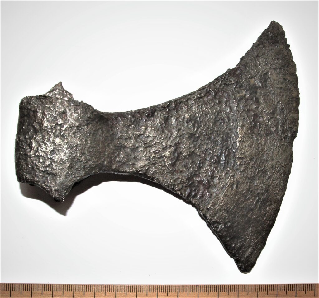 M-type iron axe, found from the well. Similar to Petersen´s Type M axe, but the later variant that in Latvia is dated to the 13th-14th century (Mugurēvičs 2008, 201; Brūzis 2016, 189).