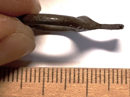Fragment of a penannular brooch with lily-shaped terminals, copper alloy. Twisted ring. Somewhat similar brooch was found in burial No 1 at Valjala churchyard in 1971 (Mägi et al 2019). Based on the shape of the ring, as well as similar brooches in inhumation graves in Couronia and in St Peter’s churchyard in Riga, the brooch can be dated to the 13th-14th century, although similar types were used until the third quarter of the 15th century (Vaska 2017, 62-64).