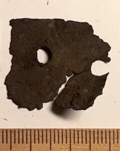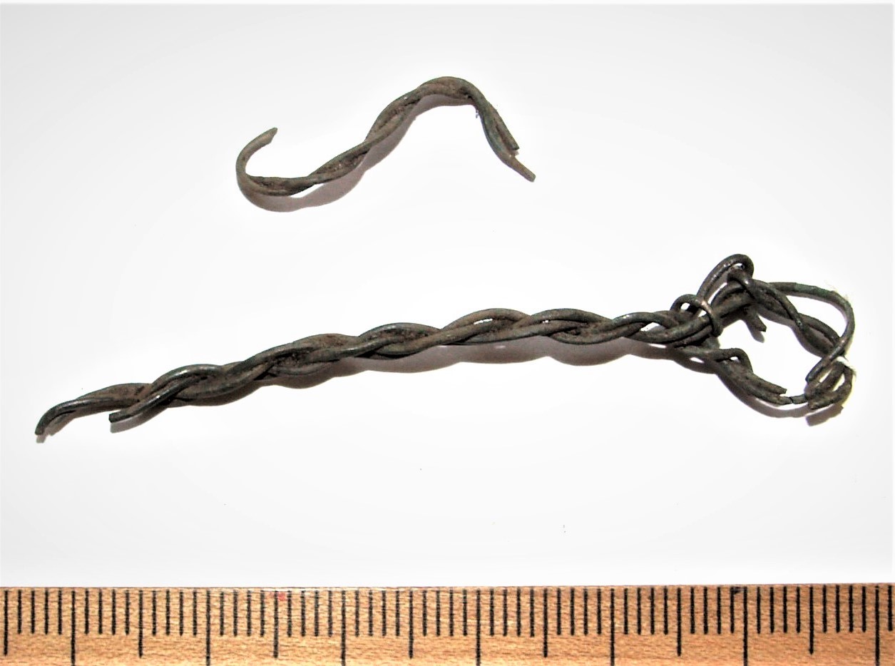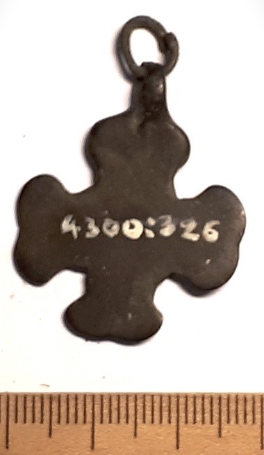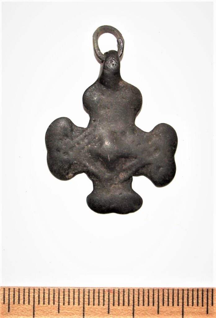 Cross-shaped pendant. According to Tuuli Kurisoo’s classification subtype B1.5.1 that have, among othrs, been found from Pada inhumation cemetery of mainly the 13th century (e. g. grave XXV). Unusual subtype that has presently only been found in Estonia (Kurisoo 2021, 62-63).