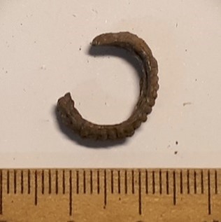 Fragment of a finger-ring with thickening grooved central part, bronze. Very widespread artefact type in late 12th-13th century Saaremaa.