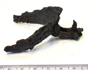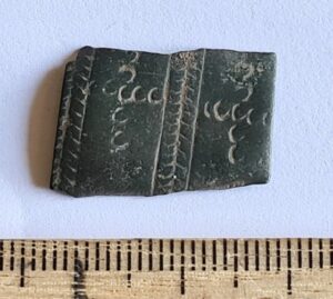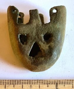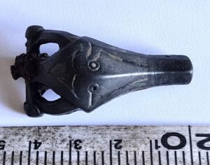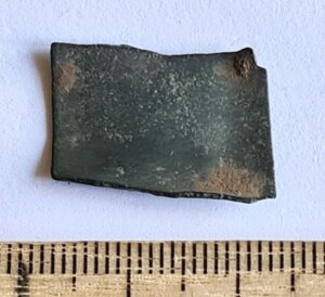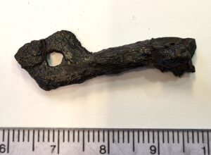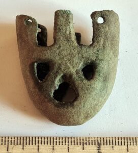 Sword scabbard end, bronze. The top part is azure, with a rather robust finish. It has not been possible to find an exact match, but in any case they seem to be missing in Latvia and Lithuania (Tomsons 2018; Kazakevićius 1992). It is possible that the sword scabbard end belongs to the medieval period, as most other finds from the surrounding area.