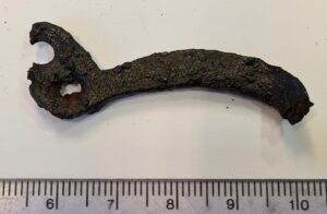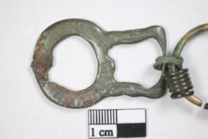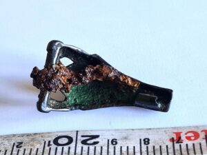Fragment of penannular brooch with lily-shaped terminals, copper alloy. Such brooches are known from medieval inhumations in Couronia, where they are dated from the second half of the 14th century to the third quarter of the 15th century (Vaska 2017, 62-64).