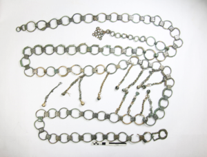 Belt chain, bronze. It is composed of 68 larger rings connected by mainly cubic-shaped distributers. The rings are ±3 cm in diameter, some have spirals slided upon them. From the rings hang 12 small spherical and four-pronged beads and a cross-pin, attached with 7 cm long chains.