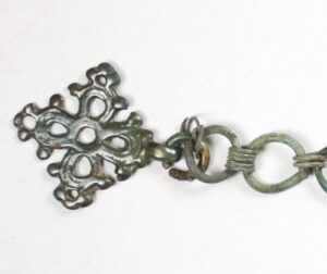 Belt chain, bronze. It is composed of 68 larger rings connected by mainly cubic-shaped distributers. The rings are ±3 cm in diameter, some have spirals slided upon them. From the rings hang 12 small spherical and four-pronged beads and a cross-pin, attached with 7 cm long chains. The cross-shaped pendant belongs to the same type as those found at Varbola hillfort, and from the inhumation cemetery at Kaberla (Kurisoo 2013, fig. 23:59), and most recently in Saaremaa at the Mullutu harbour site (Mägi 2021). It belongs to the 13th century. At one end of the belt was a flat buckle with a rounded front.