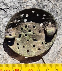 Disc-shaped brooch, copper alloy. Finnish, but recently more and more of these have been found in Estonia. Probably type C, defined by Appelgreni and dated by Pirkko-Liisa Lehtosalo-Hilander to the period 925-975. (Moilanen 2020).