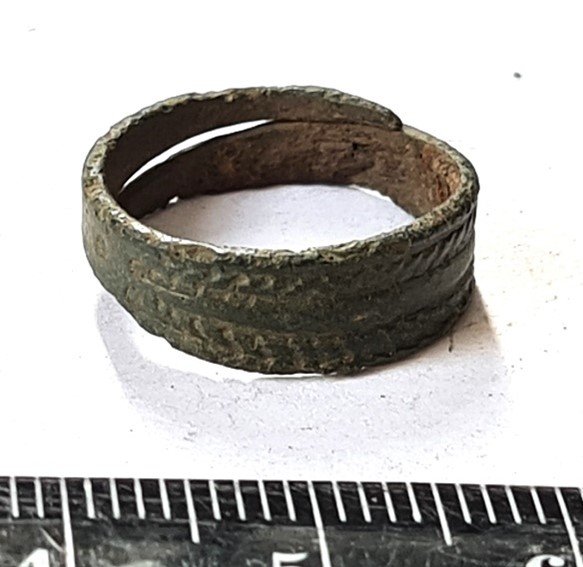 Finger ring, bronze. Open, with flat front part. The front part has a side ornament made out of intertwined lines. Rings of this type are common in Estonian stone graves. In Gotland they have been dated to the 10th-12th century (Thynmark-Nylén 1998, Taf 143: 24-28; 2006, 158), which is probably also correct for Saaremaa.