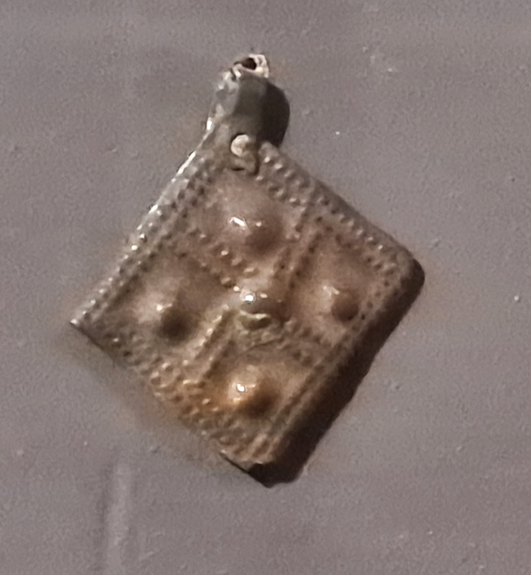 Pendant, lozenge-shaped. Such pendants are in Estonia and Latvia dated mainly to the 13th century and later (Kurisoo 2021, 146-147). Such pendants occur in several graves at Dundaga Laukmuiža cemetery in Couronis, which is dated to the second half of the 13th or the first half of the 14th century (Muižnieks & Žeiere 2021, 340). At the exhibition of Saaremaa Museum.