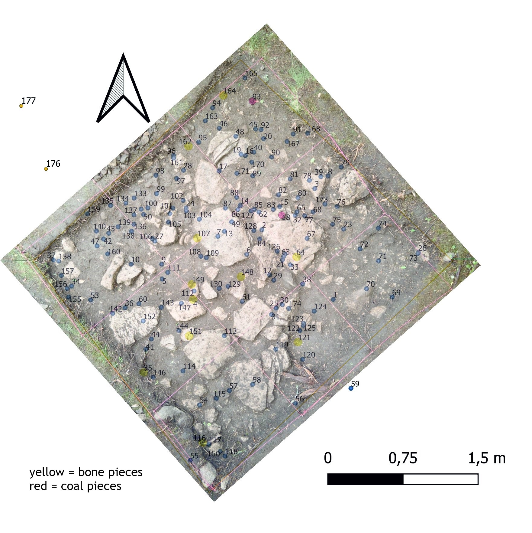 In this excavation, an earlier enclosure or wall could be assumed from the southern part of the transect, where there was no clear cultural layer under the masonry. However, the history of the construction of the rampart is still unclear at the moment, whether there was an earlier narrower stone fence that was extended or whether the entire 4 m wide rampart was constructed at one time.