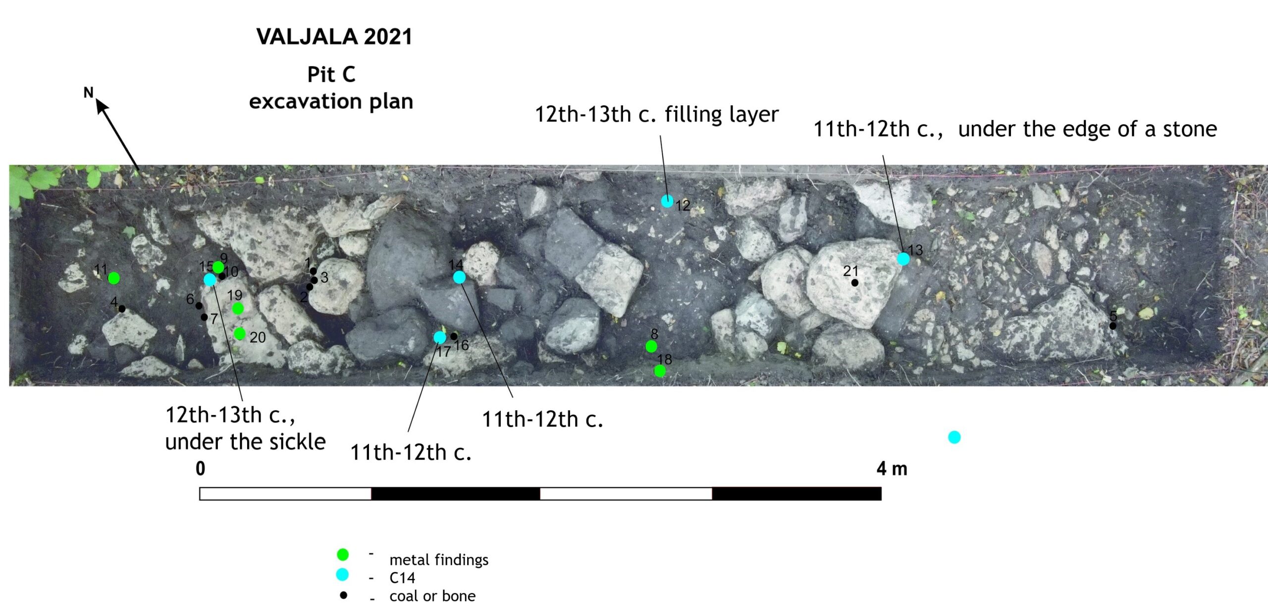 The area inside the hillfort and the area between the wall and outer area were in use in the 12th century. Some results pointed solely toward the 13th century, and most of the artifacts could also be considered to be from the middle of the 13th century or from the later decades. By the C14 results and artifacts, the middle hillfort of Valjala and the surrounding wall existed and were in use during the 13th century. According to the local folklore, the outer wall was carried away for road construction.