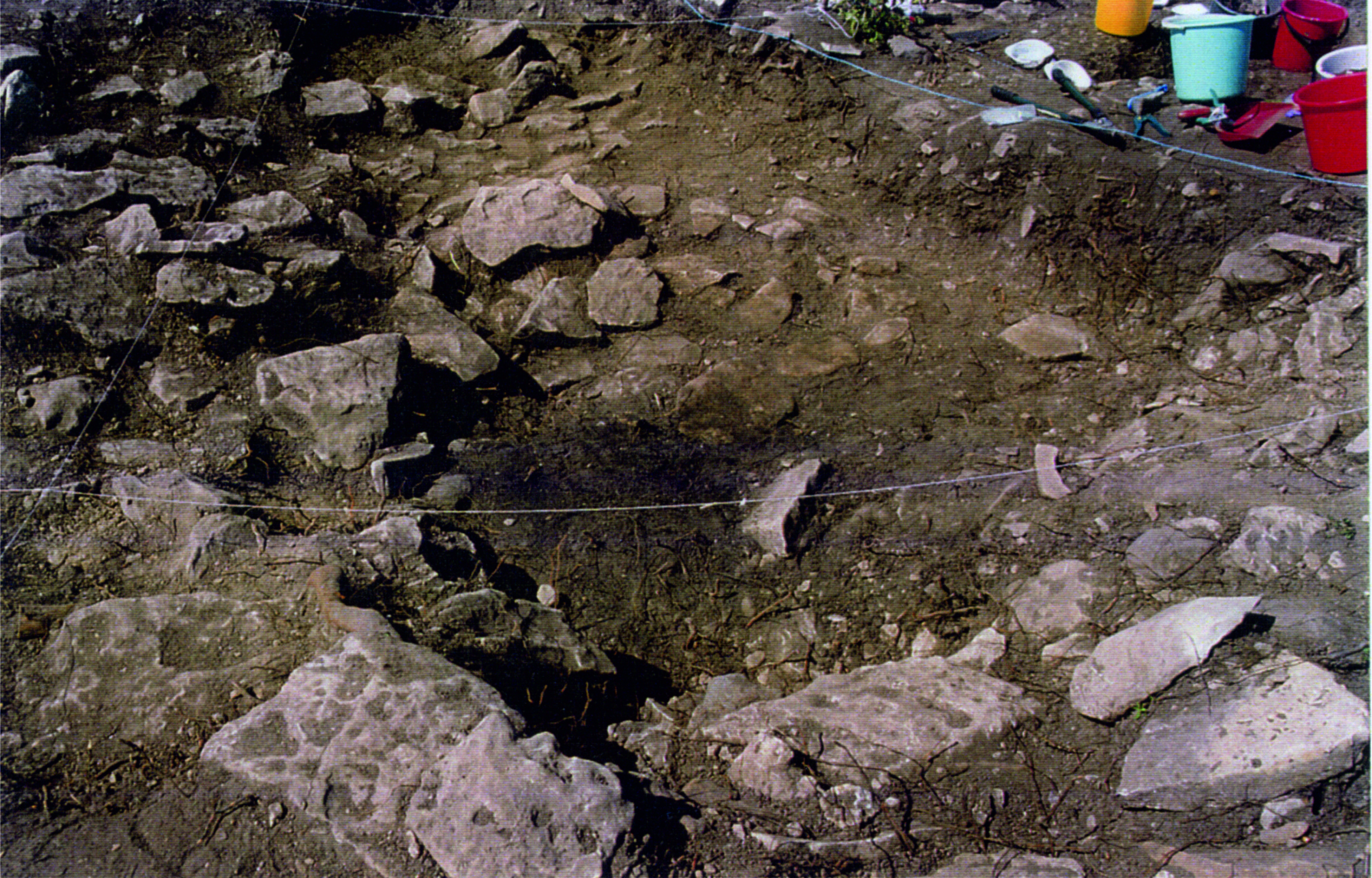 1-1,5 m kaugusel ümbritses hoone maasse süvendatud osa õhukestest paeplaatidest varinguvöönd. Tegu oli kunagise kivikatusega, mis osalt oli varisenud räästa alla, osalt aga kukkunud hoonesse sisse süvendisse ja selle ümbrusesse. Sarnast keskaegset osalt maasse süvendatud hoonet, küll ilma kivikatuseta, on kaevatud näiteks Angerja asulas Põhja-Eestis.