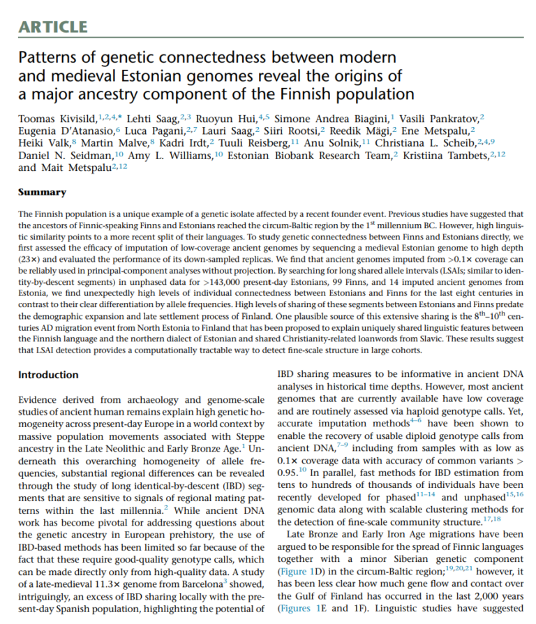 Kivisild, T., Saag, L., Hui, R., Biagini, SA., Pankratov, V., D’Atanasio, E., Pagani, L., Saag, L., Rootsi, S., Mägi, R., Metspalu, E., Valk, H., Malve, M., Irdt, K., Reisberg, T., Solnik, A., Scheib, CL., Seidman, DN., Williams, AL.; Estonian Biobank Research Team; Tambets, K., Metspalu, M. Patterns of genetic connectedness between modern and medieval Estonian genomes reveal the origins of a major ancestry component of the Finnish population. Am J Hum Genet. 2021 Sep 2;108(9):1792-1806.