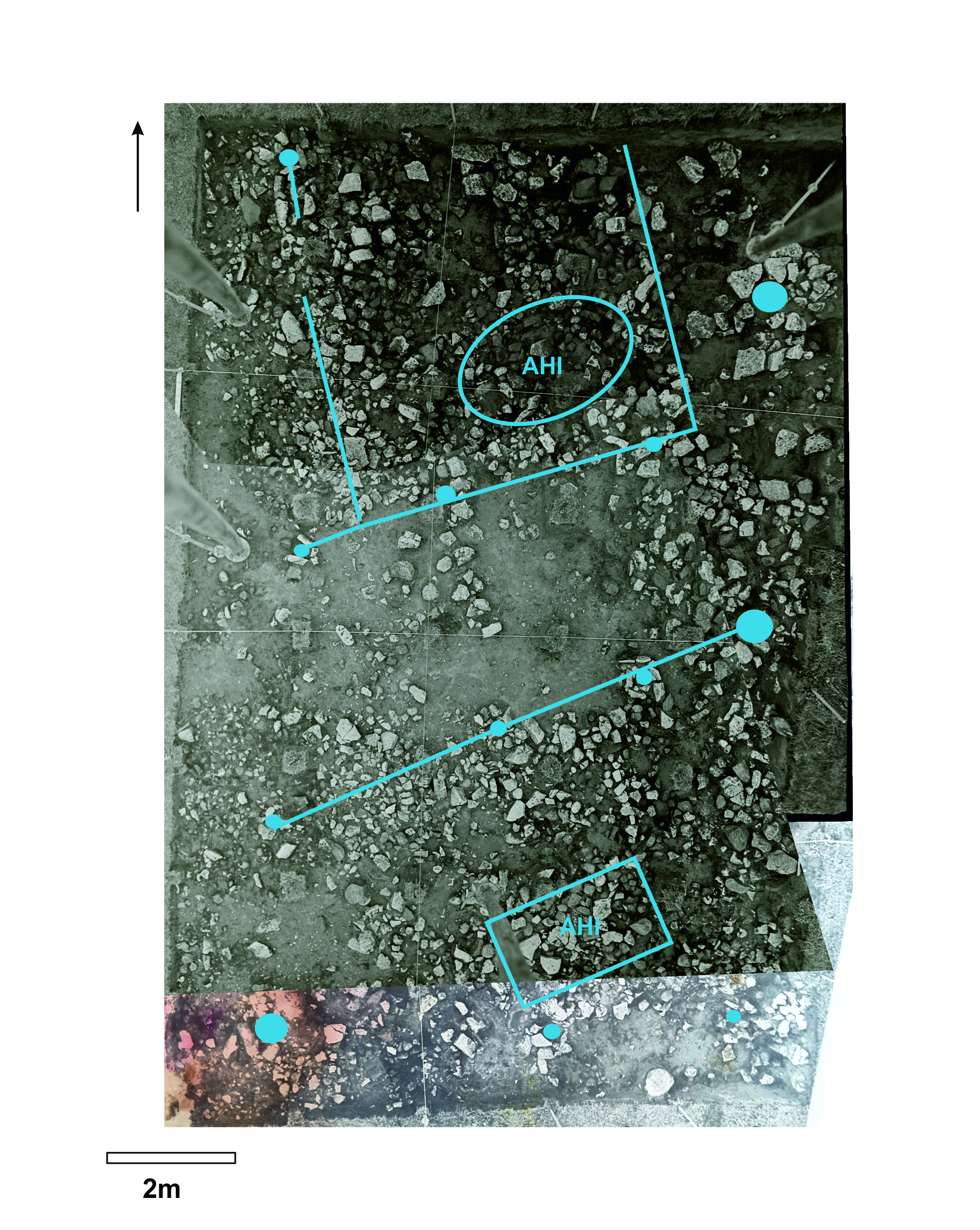 I kiht 1990. aasta kaevandis, kombineeritud eri fotodest. Sinisega on märgitud postiaugud, seinade kohad ja ahjud.