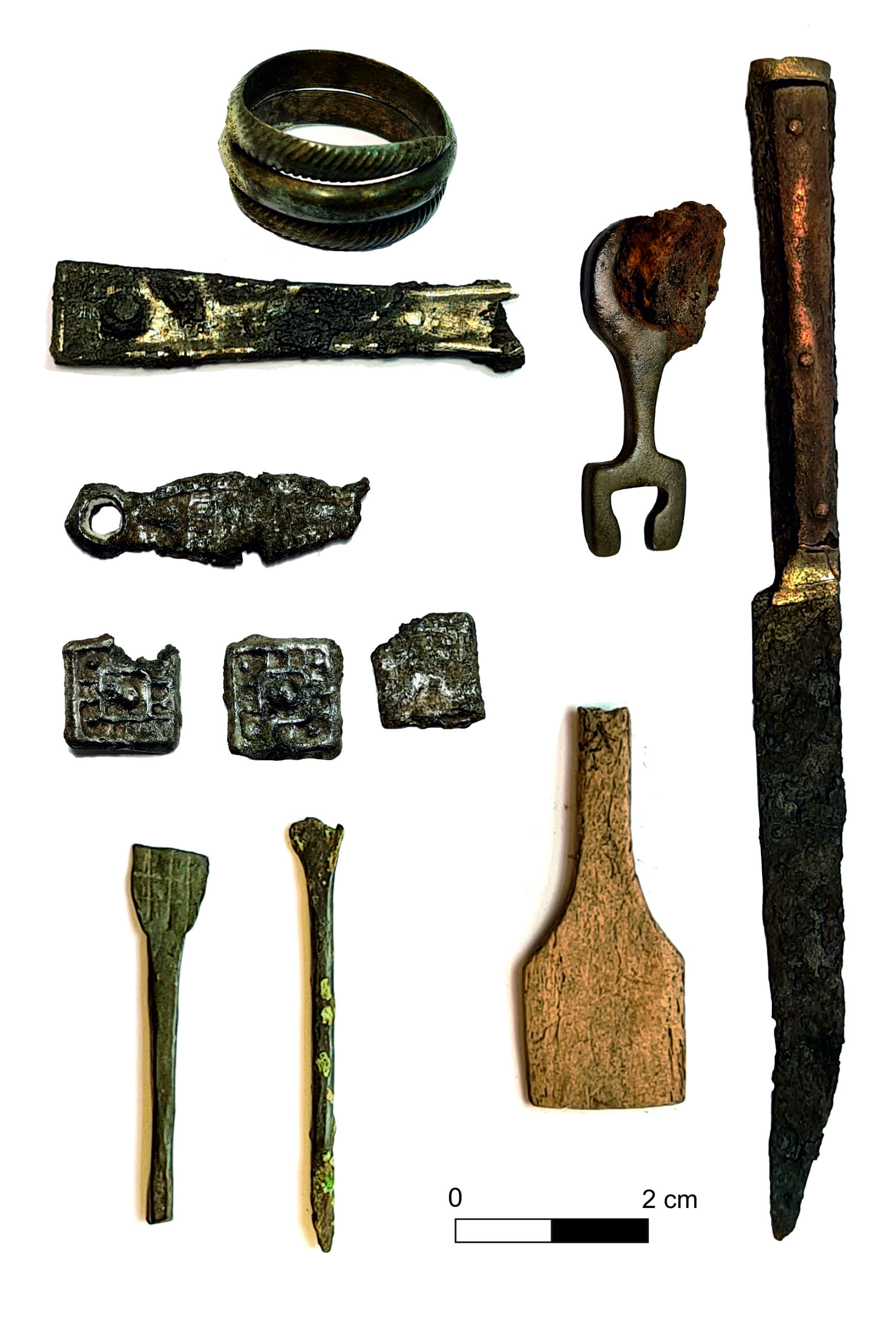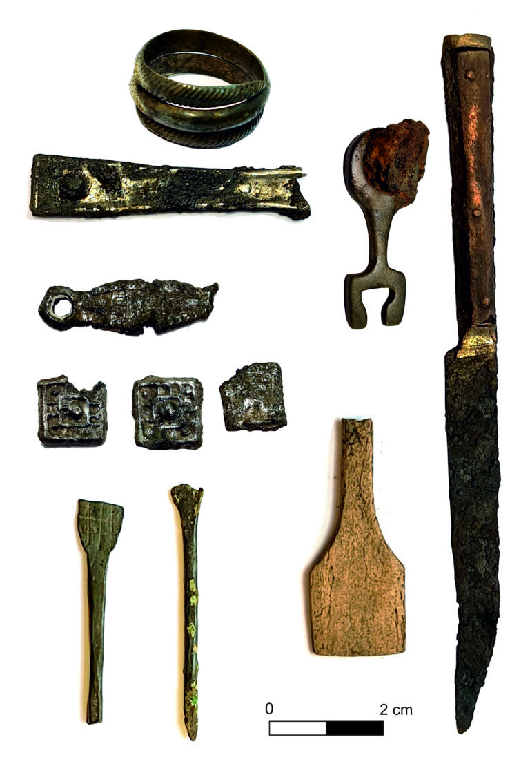 2024. aastal saadud leiud Pöide maalinna hiliseimast kasutusajast. All vasakul stilused, nende kohal tinanaastud.