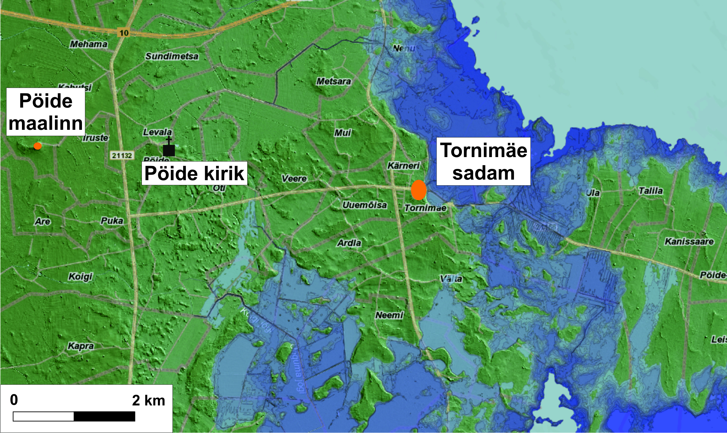 Pöide ja Tornimäe ümbrus Maa- ja Ruumiameti reljeefkaardil. Sinisega on näidatud viikingiaegne meri.