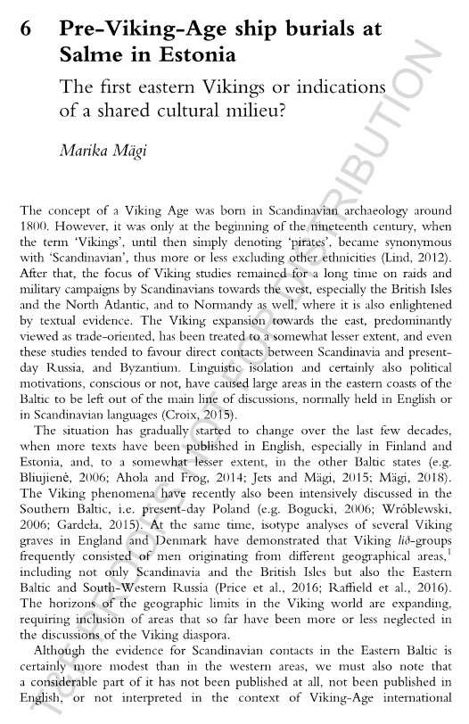 Mägi, M. (2021). Pre-Viking-Age ship burials at Salme in Estonia: the first eastern Vikings or indications of a shared cultural milieu? In: Aannestad, H. L., Pedersen, U., Mon, M., Naumann, E., Lund Berg, H. (Ed.). Vikings Across Boundaries. (80−96). Routledge.