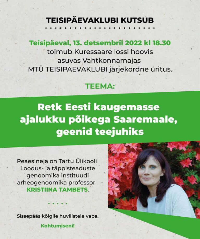 13. detsembril kell 18.30 toimub Kuressaare lossihoovis, Vahtkonnamajas MTÜ Teisipäevaklubi üritus teemal: “Retk Eesti kaugemasse ajalukku põikega Saaremaale, geenid teejuhiks.
