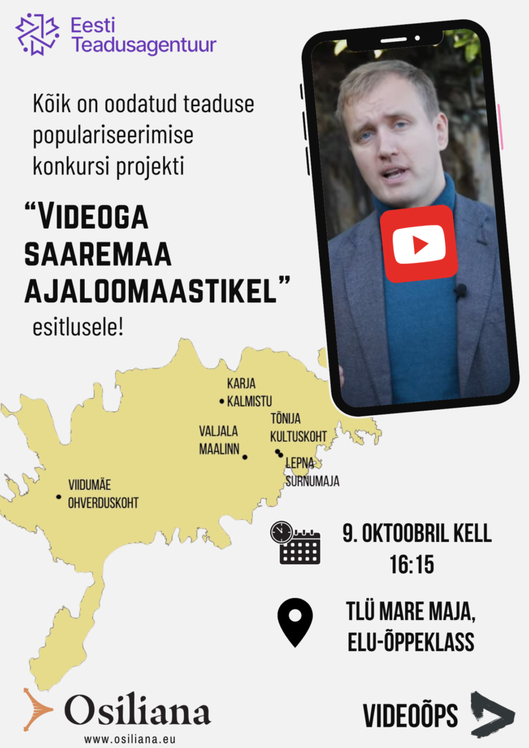 Meil on hea meel kutsuda kõiki Eesti Teadusagentuuri poolt korraldatud teaduse populariseerimise konkursi projekti “Videoga Saaremaa ajaloomaastikel” esitlusele!