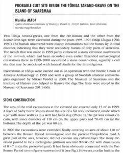 Mägi, M. (2001). Probable cult site beside the Tõnija tarand-grave on the Island of Saaremaa. In: Archaeological Fieldworks in Estonia = Arheoloogilised välitööd Eestis 2000 (48−55). Tallinn: Muinsuskaitseamet.