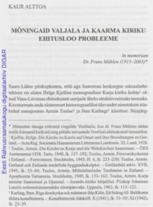 Alttoa, K. (2003). Mõningaid Valjala ja Kaarma kiriku ehitusloo probleeme. Saaremaa Muuseum, kaheaastaraamat 2001–2002 (3−27). Kuressaare: Saaremaa Muuseum.