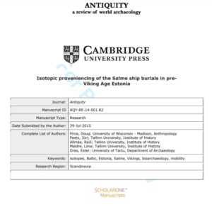 Price, T. Douglas; Peets, Jüri; Allmäe, Raili; Maldre, Liina; Oras, Ester (2016). Isotopic proveniencing of the Salme ship burials in pre-Viking Age Estonia. Antiquity, 90 (352), 1022−1037. DOI: 10.15184/aqy.2016.106.